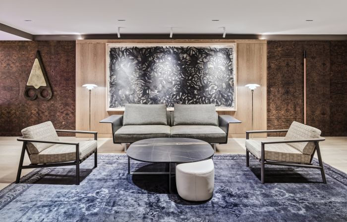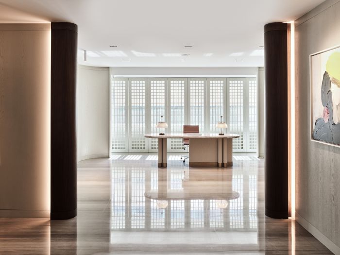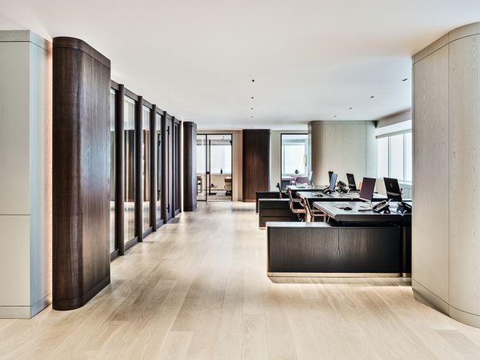 所有的辦公室都是開放式設計,透明玻璃門劃分了工作區(qū)域。從接待區(qū)到工作區(qū),木材材料逐漸使用,所以整個辦公室的調(diào)色板以米色和棕色為主。該項目的主要棕色色調(diào)以木質(zhì)元素和 大理石細節(jié)為特色。