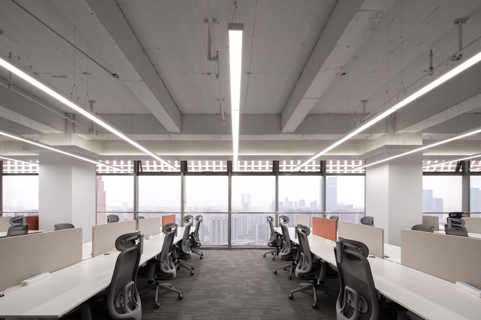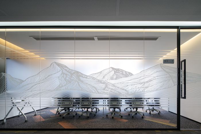 空間的一角設(shè)置有員工休息區(qū),員工可以在這個(gè)空間里休息和討論,桌椅的不同組合讓這個(gè)空間也可以作為大型培訓(xùn)的場(chǎng)所。空間內(nèi)有一個(gè)橙色的V字,是對(duì)空間原有建筑的延續(xù),使得整個(gè)空間靈動(dòng)。