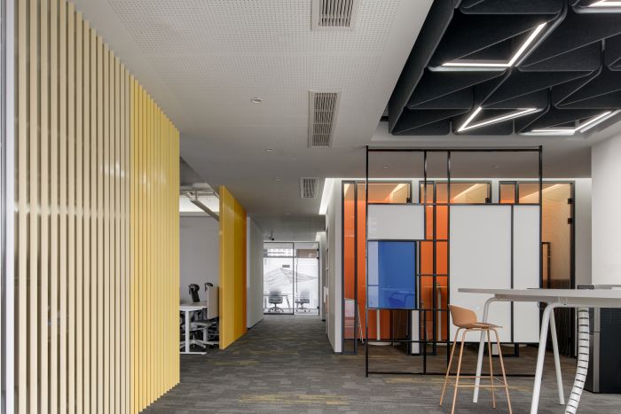 前臺(tái)空間使用了白色大理石材質(zhì),整體風(fēng)格簡(jiǎn)潔優(yōu)雅。空間右側(cè)使用企業(yè)的品牌色黃色和橙色設(shè)置了一個(gè)線條隔斷,用于分隔入口區(qū)域和辦公區(qū),保護(hù)企業(yè)辦公空間的隱私。空間讓來(lái)訪者感覺(jué)流暢現(xiàn)代,同時(shí)也充滿了企業(yè)的個(gè)性。