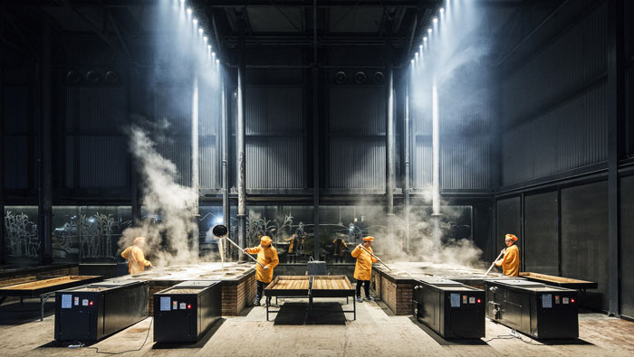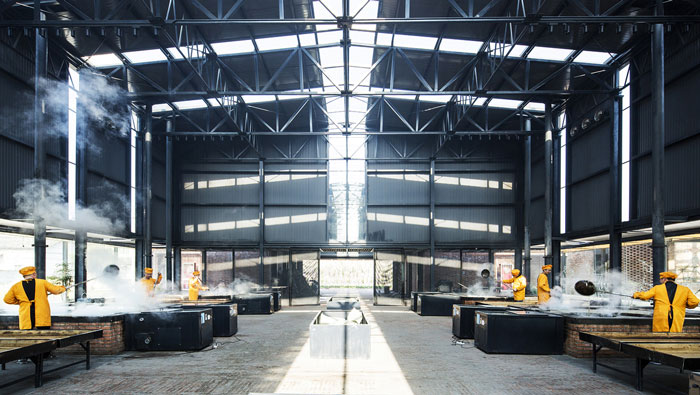 紅糖廠房車間細節裝修設計:這里強調的是對煙霧的處理,看似垂直向上的煙霧,實則也是設計師經過多次研究的結果,設計師考慮到煙霧對工作人員的影響,故此重點解決。