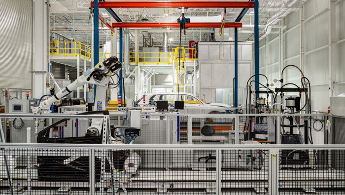 汽車工廠車間裝修設(shè)計:這里是機(jī)器人給汽車原型,進(jìn)行上裝的地方,機(jī)器人搭配先進(jìn)的涂料系統(tǒng),將各種涂料按照原本的計劃,一步不差的涂抹在車身,車輛上裝在這里完成。