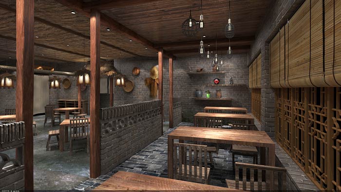 特色燒烤店餐區設計:這里給人的第一感覺就是安逸,這里所說的安逸是心靈的安逸,在這里沒有了時間的概念,設計師希望讓客戶在這里體驗日出而作、日落而息的美好生活。