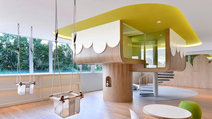 兒童教育培訓機構秋千區設計:探索樹上小木屋,讓孩子體驗像鳥一樣的自由自在,每天蕩秋千20分鐘,寶寶會快樂一整天,來源于戶外的靈感,營造舒適的室內玩耍空間。