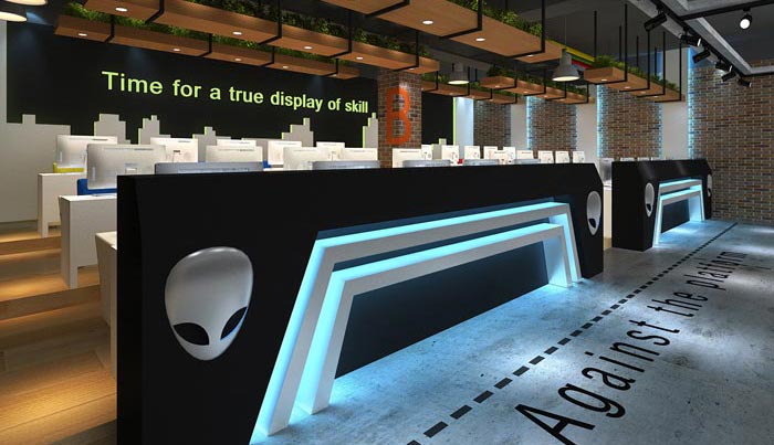 設計理念:設計師在藍月亮網咖裝修設計的時候,經過和業主的多次交談,了解到業主希望可以將網咖打造成愉悅空間。