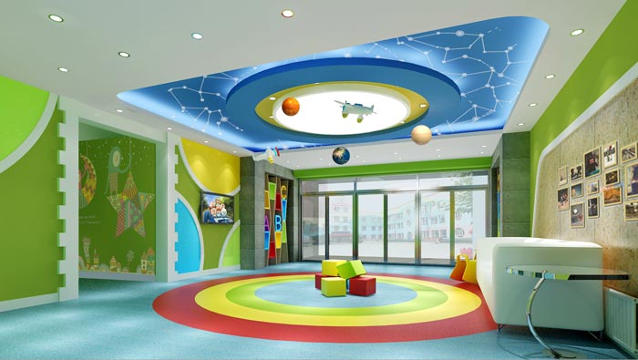 前臺大廳的設(shè)計:陽光透過大門射入室內(nèi),讓人感覺到溫馨與溫暖,設(shè)計師希望陽光可以無處不在,讓孩子在這樣的環(huán)境下可以健康、快樂的成長,在其中設(shè)計師采用了陽光、色彩之間的相互交融,設(shè)計師希望展現(xiàn)在孩子面前的是一個五顏六色的世界。