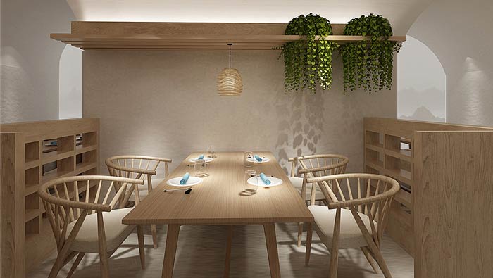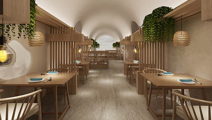 窯洞主題餐廳色彩設(shè)計(jì):整個(gè)空間有木色、綠色、自然之色三種顏色構(gòu)成,木色與綠色代表著原生態(tài),白色與周圍的自然風(fēng)景融為一體,讓人恍如夢(mèng)幻之中。