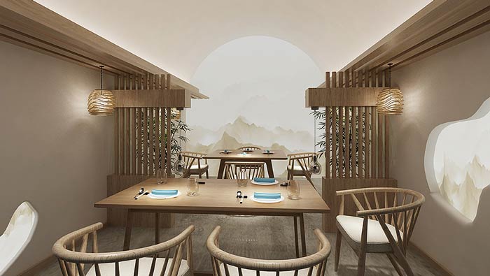 窯洞主題餐廳包房設(shè)計(jì):包廂內(nèi)部可以容納7-8個(gè)人,墻面上繪畫的山水、自然,讓人仿佛真的置身于自然之中,自然美景與中華文化完美的鑲嵌在整個(gè)空間之中。